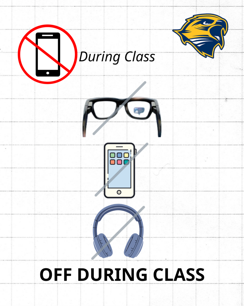 Students may not use cell phones, headphones, or similar electronic devices—including wearable tech like META glasses—during instructional time. Devices may be used before and after school, during passing periods, off-periods, and at lunch. Staff may ask students to put devices away, and repeated violations may result in confiscation and further consequences. Thank you for helping us keep classrooms focused on learning.