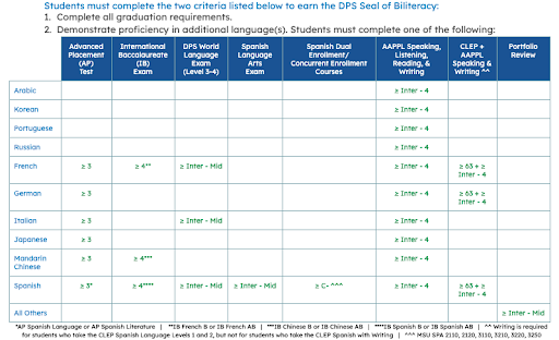 The Colorado Seal of Biliteracy recognizes students who can speak, read, and write in English and at least one other language. This prestigious honor is added to a student’s transcript, comes with a graduation cord, and is celebrated at a district ceremony—a great way to strengthen college applications and future job opportunities.