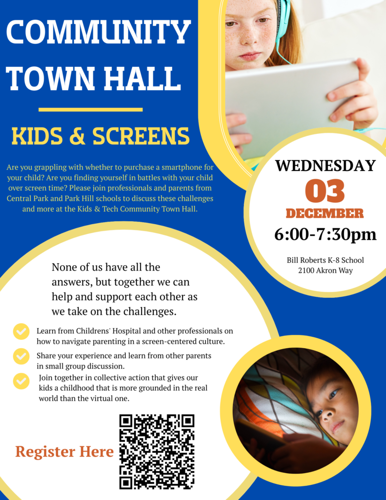 Are you grappling with whether to purchase a smartphone for your child? Are you finding yourself in battles with your child over screen time?  Please join professionals and parents from Central Park and Park Hill schools to discuss these challenges and more at the Kids & Tech Community Town Hall.