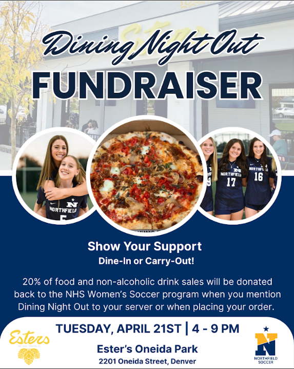 20% of food and non-alcoholic drinks will go back to Northfield High School Women’s Soccer Program from 4:00-9:00pm when mentioning the NHS Soccer Program to your server. Can’t dine in, take out orders count towards the donation too!