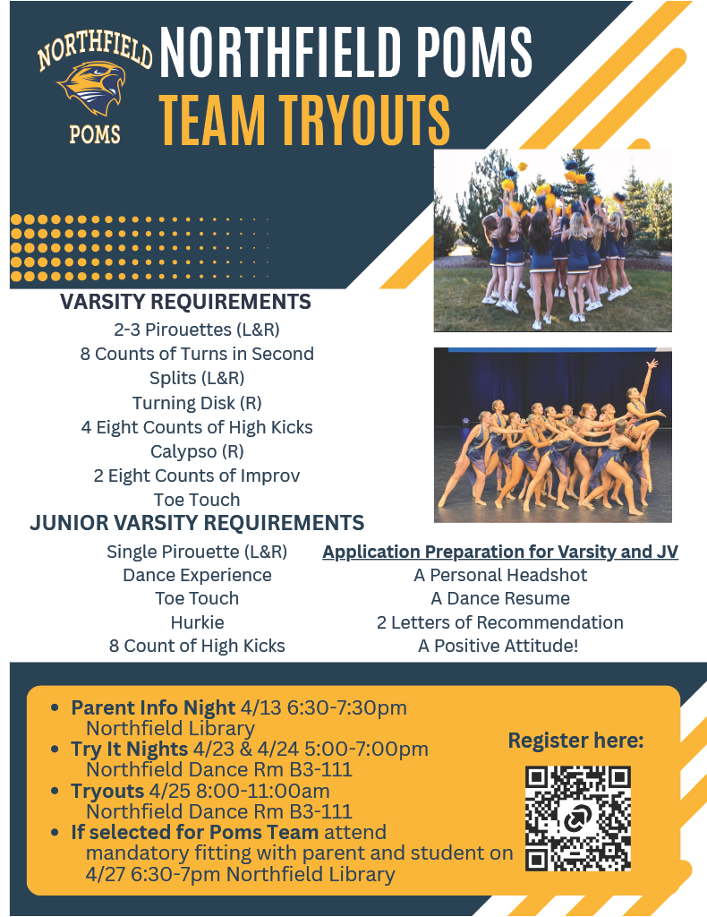 Searching for our next Pom Team members! We’d love to see our next talent at Information Night and Try It Nights leading up to our Tryouts this April. See flyer for more information on skills required, dates, and registration.